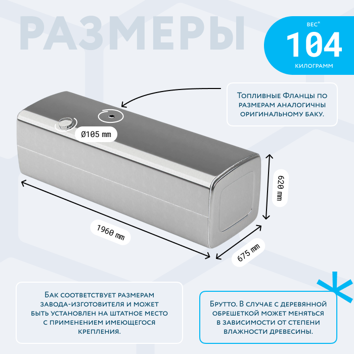 - Так же, если вы приобретаете алюминиевый топливный бак, он будет в деревянной обрешетке (для усиления защиты при транспортировке). При просчете веса и объема, цена за доставку может измениться по факту взвешивания на самом терминале транспортной компании. Так как деревянная обрешетка соответственно изготовлена из древесины, и она имеет свойство значительно набирать вес в зависимости от влажности окружающей среды.