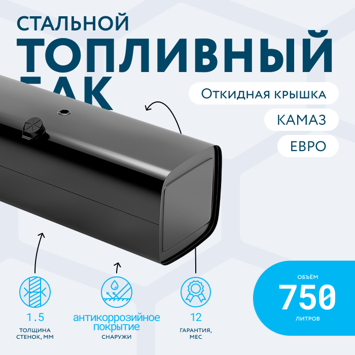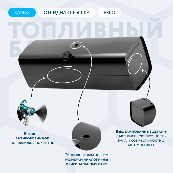 Данный топливный бак предназначен для замены основного стального бака на а/м КамАЗ с модификацией двигателя ЕВРО-3 и выше.