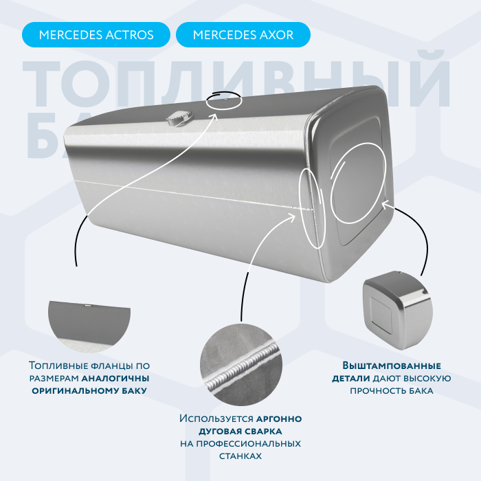 Алюминиевый бак не подвержен коррозии, что делает его более долговечным, а так же сбережет вашу топливную систему. Бак из алюминия в два раза легче стального бака, хотя он и изготовлен из листа увеличенной толщины в 2,5 мм. В конструкции предусмотрены цельные перегородки, которые проварены по периметру. Баки из алюминия так же оснащены заливной горловиной с самозапираемым непроливаемым клапаном (который становится барьером для разлива топлива, а так же становится защитой от попадания мусора в бак при открытой крышке) . Кроме того, однозначно что алюминиевый бак выглядит намного привлекательнее и дороже - где бак в том числе становиться и элементом тюнинга автомобиля. На алюминиеввые баки действует увеличенная гарантия - 36 месяцев.