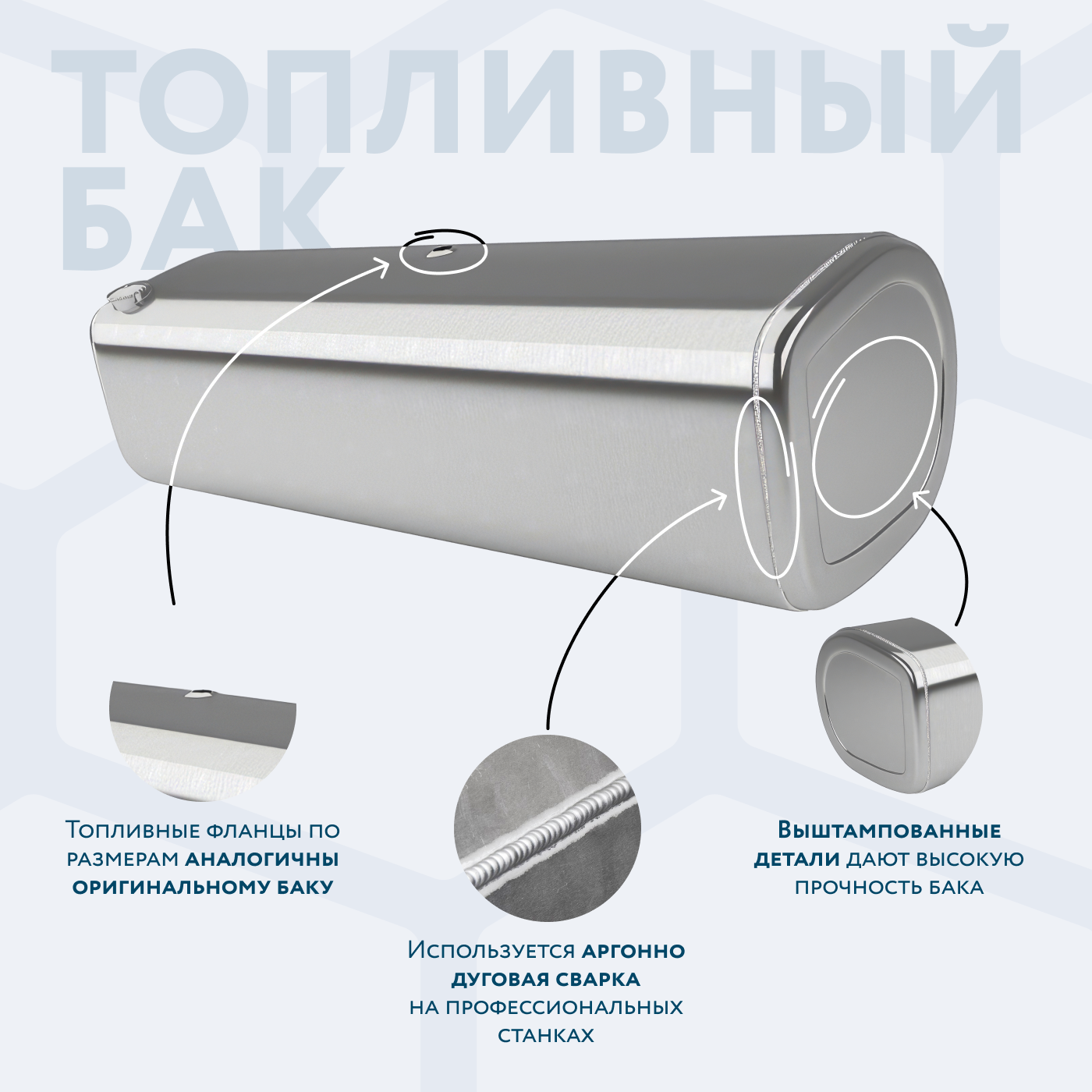 Алюминиевый бак не подвержен коррозии, что делает его более долговечным, а так же сбережет вашу топливную систему. Бак из алюминия в два раза легче стального бака, хотя он и изготовлен из листа увеличенной толщины в 2,5 мм. В конструкции предусмотрены цельные перегородки, которые проварены по периметру. Баки из алюминия так же оснащены заливной горловиной с самозапираемым непроливаемым клапаном (который становится барьером для разлива топлива, а так же становится защитой от попадания мусора в бак при открытой крышке) . Кроме того, однозначно что алюминиевый бак выглядит намного привлекательнее и дороже - где бак в том числе становиться и элементом тюнинга автомобиля. На алюминиеввые баки действует увеличенная гарантия - 36 месяцев.